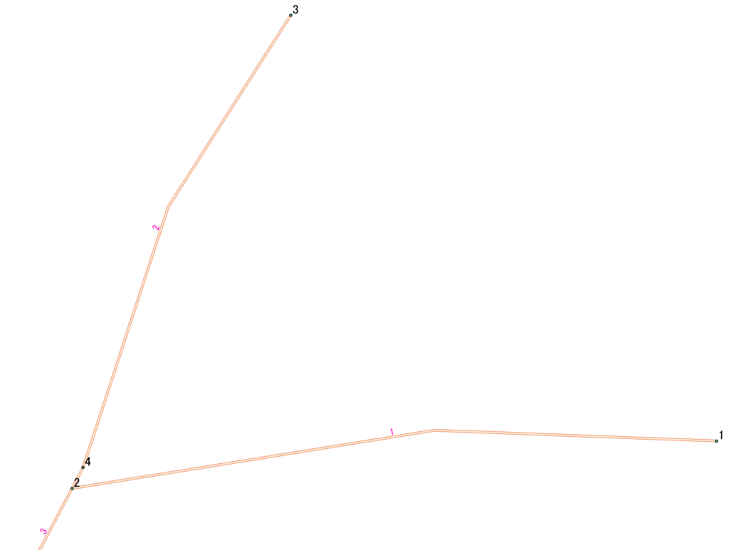 ですが、近づけ方が悪いと、GISが「折れ線3の上ぴったりに、終点(点2)を置くんですね」と解釈してしまいます。点2が点4に重なるかどうかまでは考慮してもらえません。